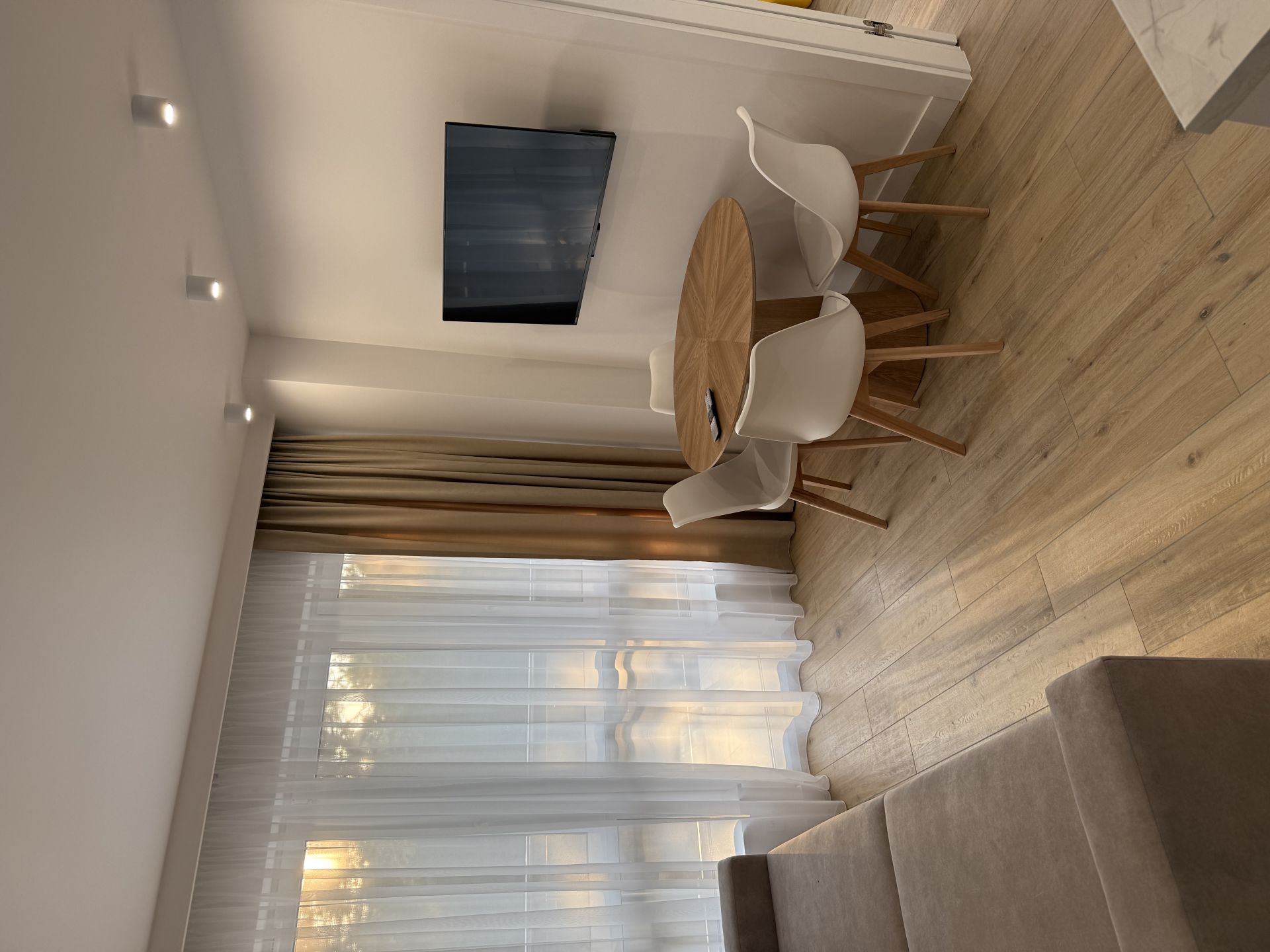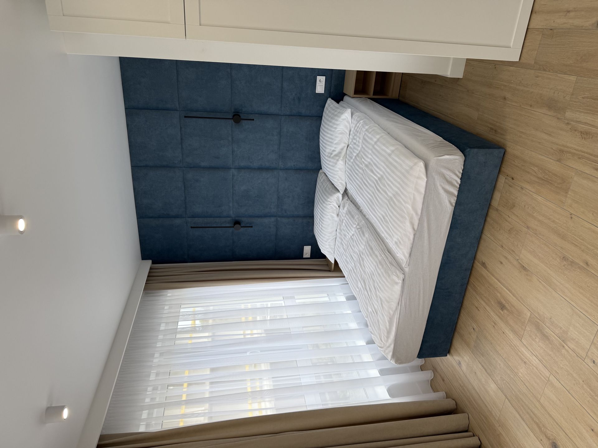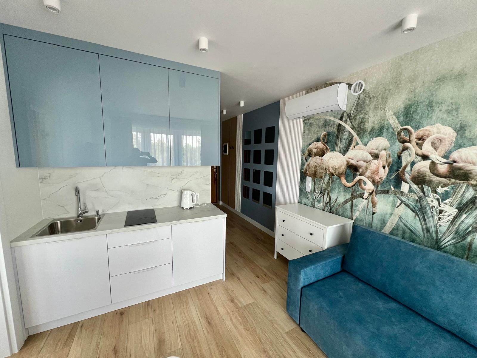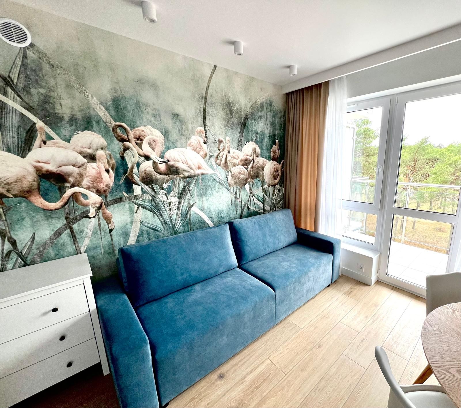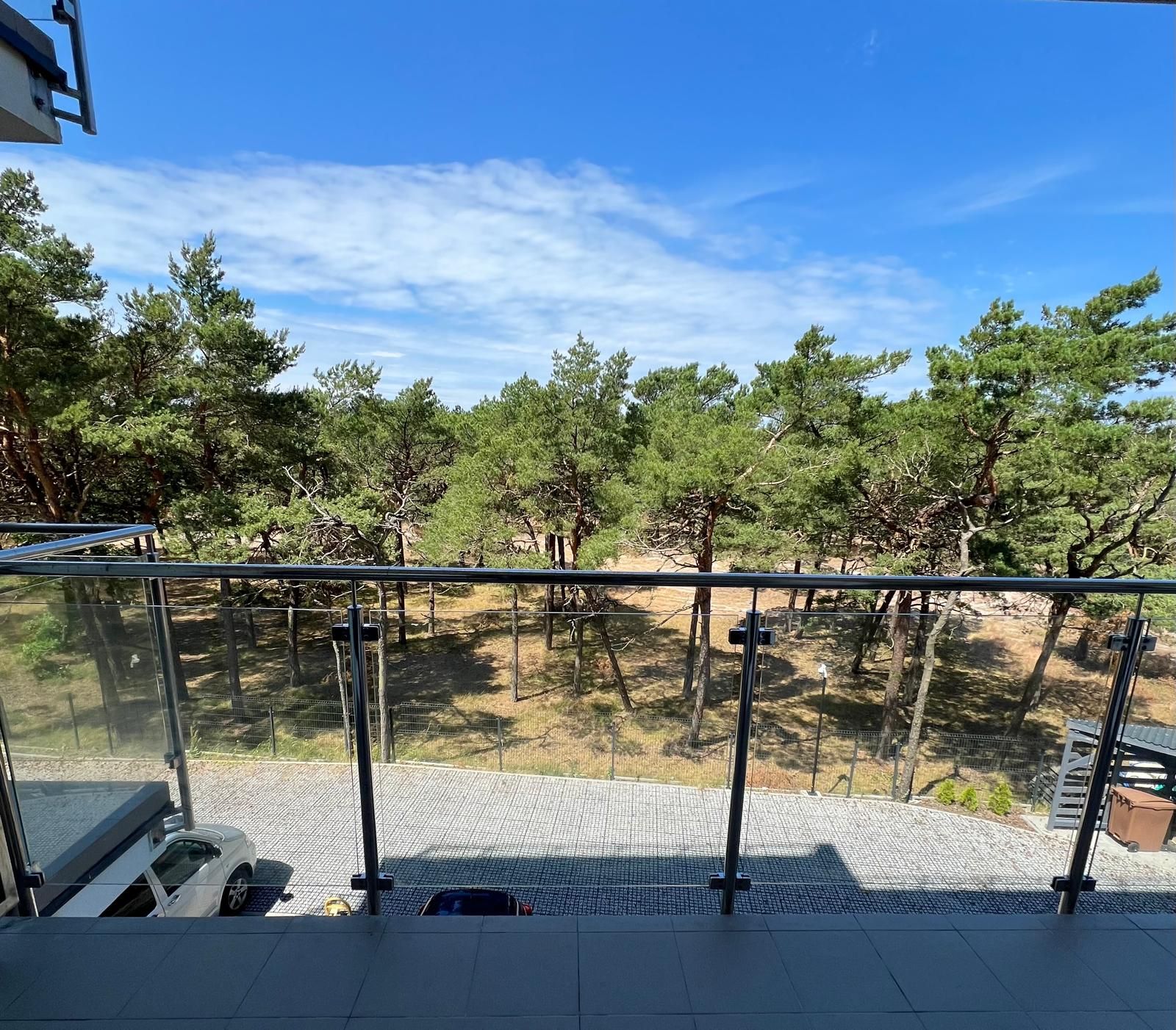 Apartament 4 osobowy dwupokojowy z jedną sypialnią z łóżkiem typu King-size , kuchnią i łazienką o powierzchni 33m2 usytuowany na drugim piętrze z dużym balkonem z widokiem na las , w budynku znajduje się winda.